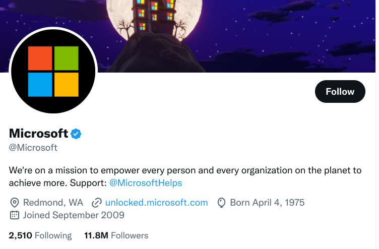 Bill Gates personal twitter account has 60.8M followers and his company's twitter account "only" 11.8M. You see where I'm getting? And when we're talking about putting yourself out there...